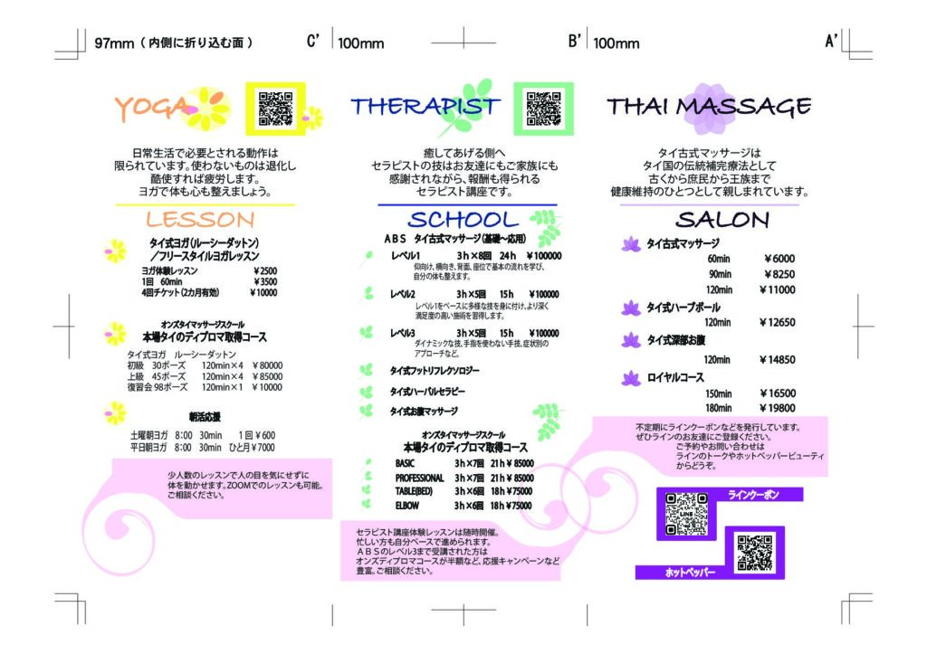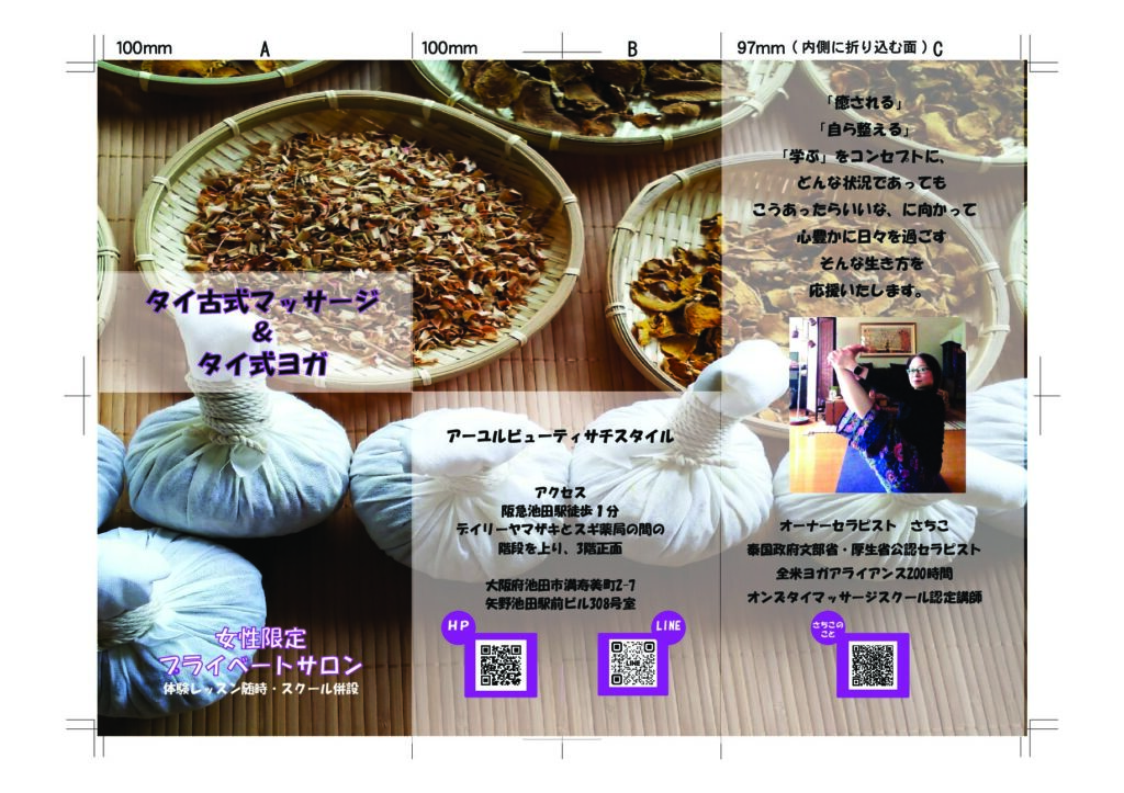 三つ折りの表と裏です。ロータスとかタマリンドの葉とかマトゥームとか、イラストを作成してみたり。