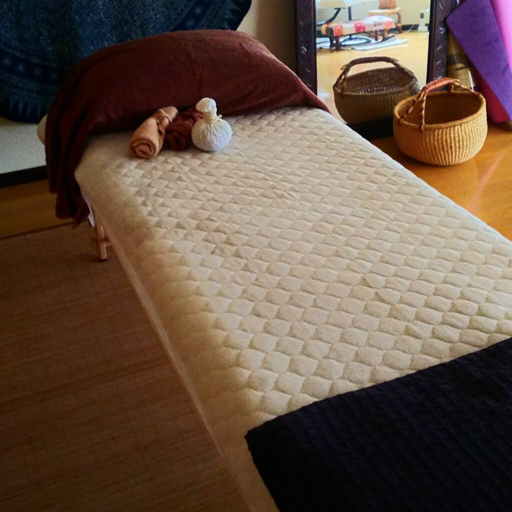 タイ古式に肩や背中など、あなたのお悩みどころに、蒸し器で温めたタイのハーブ(サムンプライ)のボールを押し当て、巡らせます。