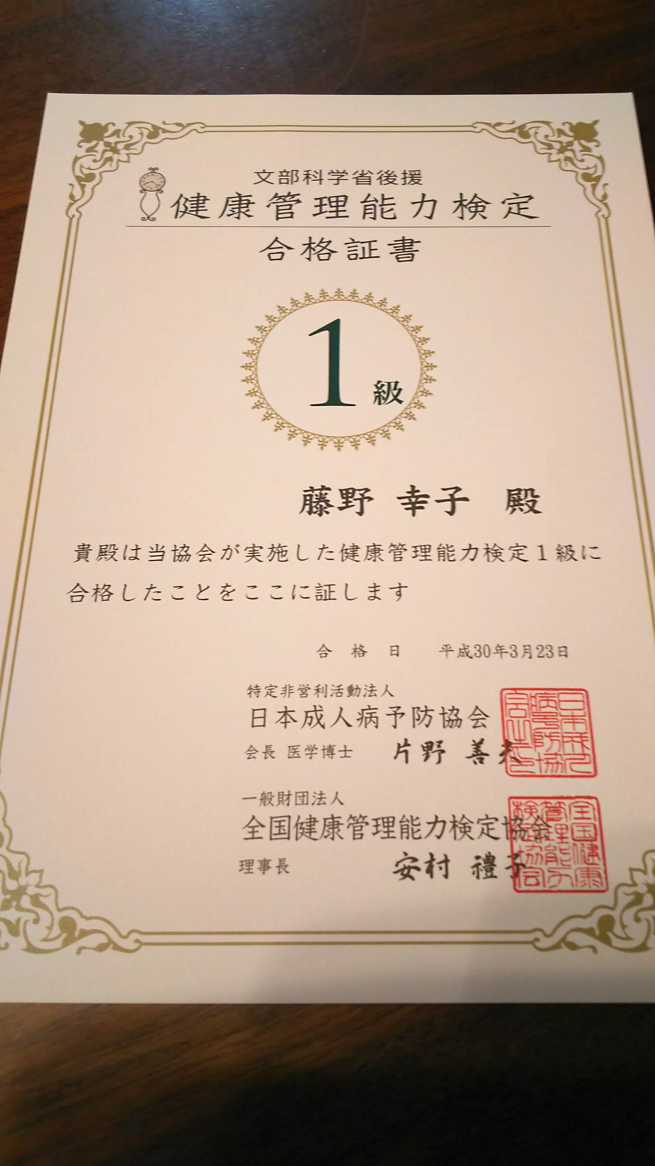 健康管理能力検定1級合格証書です♪